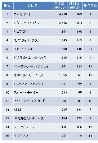5位から10位までは、5位が米連邦住宅抵当公社(ファニー・メイ)(1,538億ドル)、6位が複合企業ゼネラル・エレクトリック(1,516億ドル)、7位が著名投資家ウォーレン・バフェット氏が率いる投資会社バークシャー・ハサウェイ(1,361億ドル)、8位が株式市場に再上場した自動車大手ゼネラル・モーターズ(1,355億ドル)、9位が銀行大手バンク・オブ・アメリカ(1,341億ドル)、10位が自動車大手フォード・モーター(1,289億ドル)だった。
