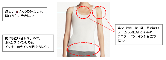 同商品は、特殊な技術を採用した縫い目のないシームレス仕様に加え、縫製部分も肌に負担がかからない仕立てになっておりソフトな肌あたりを実現。また、ネックと袖口だけではなく裾の縫い目も無くすことで、タイトなスカートやパンツなどの衣服内のもたつきを軽減し、快適な着心地をサポートする。さらに、裾のめくれ上がりを軽減する編み設計を採用、通気性も高いため暑くなり汗ばむ季節にも快適に過ごせるという。
