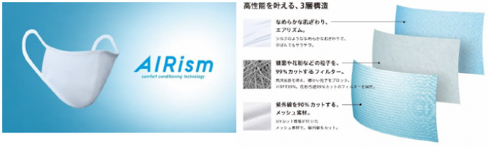 「エアリズムマスク」は、表側のメッシュ素材と内側のエアリズムの間に高性能フィルターを挟んだ3層構造。高性能フィルターは飛沫や細菌、ウイルスが付着した粒子、花粉などをブロックし、繰り返し洗濯しても効果は持続するという。表側のメッシュ素材は紫外線を90%カットする。