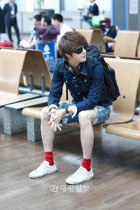 チョン・イル、真っ赤なソックスとブルーデニムのファッションを空港で披露