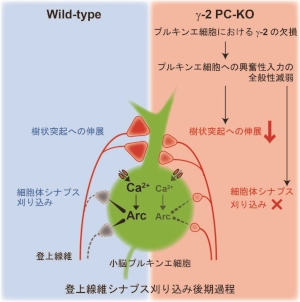 図内左の「Wild-type」は通常のマウスのシナプス刈り込みのメカニズムを、図内右の「γ-2 PC KO」は神経伝達物質を受け取る蛋白質の量を制御しているTARPγ-2という分子をプルキンエ細胞で欠く遺伝子改変マウスの刈り込みのメカニズムを模式的に表す(東京大学の発表資料より)[写真拡大]