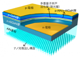 今回、ナノ光構造技術により、深紫外LEDの光取出し効率を大幅に向上させることで、小型・高出力な深紫外LED光源が実現した。開発された深紫外LEDは、最も殺菌性の高い波長265nm、室温・連続動作で、光出力90mWを達成。これまでにない実用上要求される水準を十分に上回る。これにより、殺菌から医療、工業、環境、ICTに至るまで幅広い分野の産業、生活・社会インフラに技術革新をもたらすことが期待される。