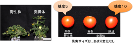 今回の研究では、筑波大学遺伝子実験センターが有するトマト品種「マイクロトム」の大規模変異体集団の中から、旺盛な生育を示す新規の単為結果性(受粉なしで果実が肥大する性質)の変異体を発見し、さらにその果実は高糖度であることを明らかにした。また、その原因遺伝子も同定することに成功した。