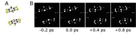 A:光励起前のPt(dmit)2二量体の構造の模式図。灰色の球がPt原子、黄色の球がS原子、黒色の球がC原子を表す。B:電子線回折像を解析して作成した、各遅延時間におけるPt(dmit)2二量体の構造。Aの模式図と同じ方向から見ており、白い球体が各原子を表す。(東京工業大学の発表資料より)[写真拡大]