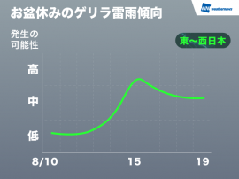 お盆は前半は晴れ、後半はゲリラ降雨に―ウェザーニューズ