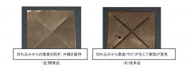 また、銅箔に接着剤で被膜を作り、切れ込みを入れて塩水を与えるという実験も行った。すると、従来品では切れ込みから銅が腐食して色が変化していないのに対し、新開発の接着剤では変色が起こらなかった。
