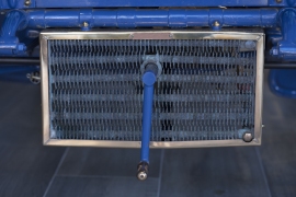 バンバーに鍵穴みたいなクランク棒を差し込む穴があり、そこからクランク棒を突っ込んで、エンジンのクランクシャフトを回してやる訳だ。1960年代までの車には、クランク棒を積んであるのが普通だった。