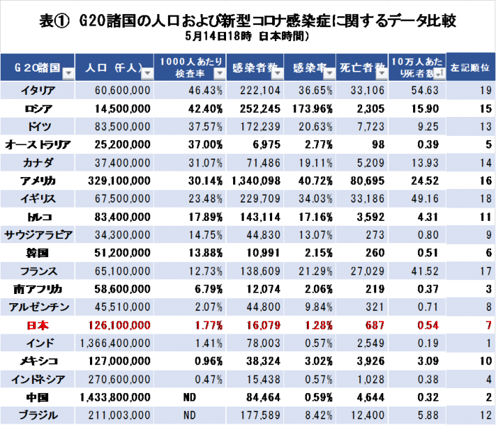 表①は、G20諸国のうち、EUを除いた19国の人口と感染率、死亡者数、その割合を取り出し、検査率の高い国から順に並べたものです。日本は検査率が低いから感染者も少ない、という根拠になっていると考えられます。