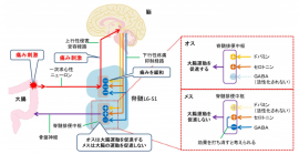 するとオスでは、ドーパミンやセロトニンが放出され、脊椎の排便中枢を活性化させて大腸運動を促進された一方、メスでは、ドーパミンが放出されず、セロトニンやGABAが放出され、大腸運動が促進されなかった。