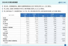 2024年3月期決算概要についてご説明します。受注高は、健康・医療環境施設の大型工事受注等により、前期から大幅に増え、12.5パーセント増の975億8,600万円となりました。堅調な受注を受け、次期繰越高も前期比7.2パーセント増の882億9,000万円となっています。