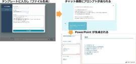 生成AIとのやり取り内容から、ワンクリックでPowerPointファイルを自動生成・ダウンロードできるようになった。自社独自のスライドマスター登録にも対応しており、資料作成や会議準備の効率化を実現する。簡易なプロンプト入力後、登録済みスライドマスターに応じたPowerPointファイルを自動作成する仕組みである。