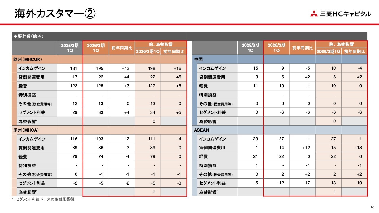 あらためて、この海外カスタマーセグメントについては、欧州事業が伸長したことにより、為替影響を除くとインカムゲインは増益しています。また、貸倒関連費用については、先ほどご説明したとおり、ASEAN事業の事業構造改革費用により増加していますが、昨年度高い水準にあった米州事業では前年同期比でほぼ横ばいとなりました。