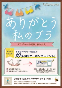 女性用靴下・インナーの企画・販売を行うチュチュアンナ(大阪市、上田利昭社長)は12月21日から、不要になったブラジャーを回収して再資源化する「ブラリサイクル」を開始した。