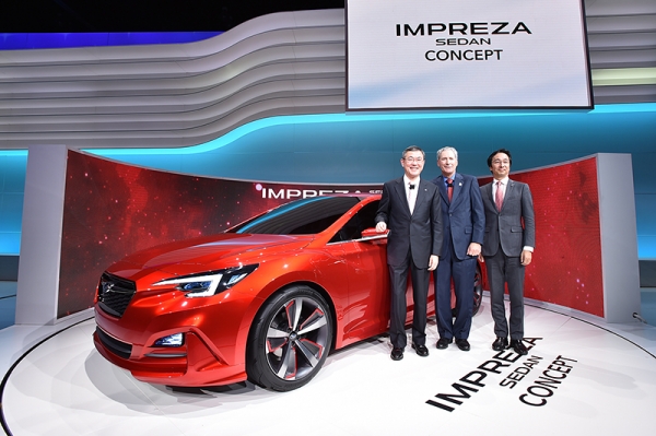 富士重工業は19日、米ロサンゼルスで現地時間17日から開催されているLAオートショーで、次期インプレッサをイメージしたセダンスタイルのデザインコンセプトカー「IMPREZA SEDAN CONCEPT」を世界初公開したと発表した。 同社によると、「IMPREZA SEDAN CONCEPT」は、スバルラインアップのエントリーモデルとして、コンパクトなボディサイズ感の中でダイナミックかつソリッドなスバルらしいデザイン要素を大胆に表現している。また、クラスを超えた質感を融合させ、インプレッサだけでなく、今後のスバルデザイン全体の方向性を提示しているという。 機能性についても、優れた空力性能を確保することで、スタイリングとの融合を実現しているという。エクステリアカラーは、スポーティでエネルギッシュな印象を追求した「ルビーレッドメタリック」を採用し、高い質感を持つグロスブラックと組み合わせた。 写真は、左から富士重工業の吉永泰之社長、スバル・オブ・アメリカのトーマス・ドール社長兼COO、石井守・商品企画本部デザイン部長。(写真提供:富士重工業) -