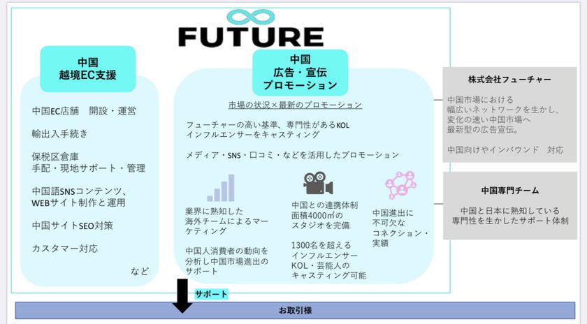 当社は中国市場における幅広いネットワークがあり中国事情に熟知していることから、広告・宣伝と中国越境EC支援を専門に行う会社として、2019年4月に株式会社フューチャーを設立しました。