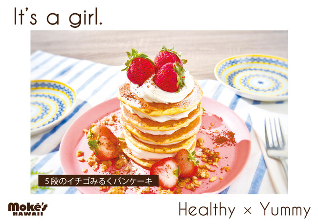 ハワイで行列のできる人気店「モケス ハワイ」中目黒店では、5段のイチゴみるくパンケーキ「It's a girl」の販売を開始いたします。