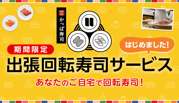 かっぱ寿司では出張回転寿司サービスの提供を通して、ご自宅に居ながら、かっぱ寿司のお店のような楽しい時間をお過ごしいただけるよう、サービスの提供をしてまいります。