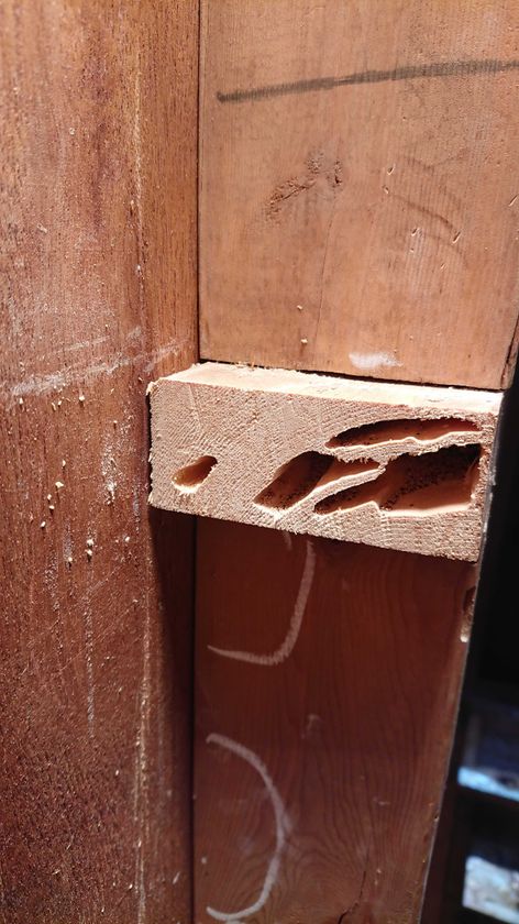 ・一般的なシロアリと違って、アメリカカンザイシロアリは羽アリが直接木材に入り込んで営巣する。
