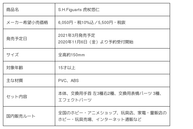 株式会社BANDAI SPIRITS(代表取締役社長:福田祐介、本社:東京都港区)は、2020年10月2日より毎週金曜日 深夜1時25分から、MBS/TBS系全国28局ネットにて放送開始するTVアニメ『呪術廻戦』より、各地に散らばっている呪いの王・両面宿儺の指を約1/1スケールでリアルに再現した大人向けなりきりディスプレイモデルの『PROPLICA 特級呪物 両面宿儺の指』(2,750円・税10%込/2,500円・税抜)と、主人公・虎杖悠仁のアクションフィギュア『S.H.Figuarts 虎杖悠仁』(6,050円・税10%込/5,500円・税抜)を、2020年11月6日(金)より予約受付開始、2021年3月に日本国内で発売し、以降海外でも順次発売予定です。