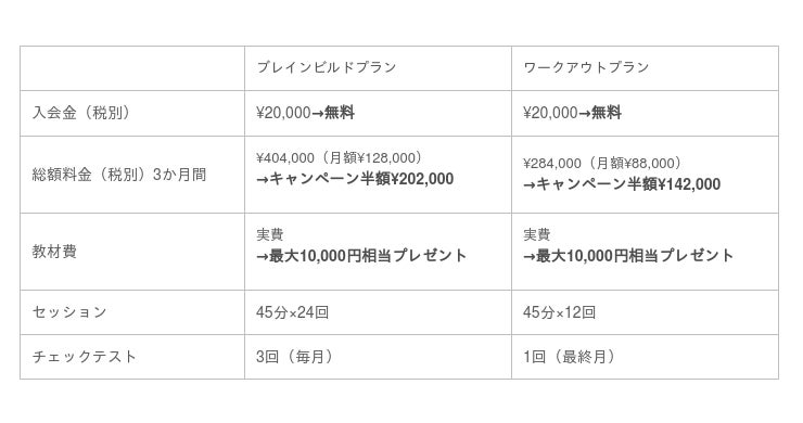 この度、より多くの皆さまに当社サービスをご利用いただけるよう、先着10名限定で入会金を免除、10,000円相当の教材を無料進呈、月額プラン料金が完全半額(ブレインビルドプランお申込みの場合最大202,000円割引)となる『オウチ学習応援キャンペーン』を実施しております。スマートフォンアプリで学習進捗を管理しながら、個別に最適化された当社オリジナルメソッドで高スキルなコーチ陣が90日間徹底的に指導することで、本当に必要な英語スキルの習得を的確にサポートいたします。英会話スクールに長年通っても英語が身につかないと感じている方は、是非この機会に『オウチ学習応援キャンペーン』を活用して、一生モノの英語力を身につけてみませんか。