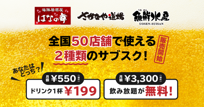 食マーケティング総合企業の株式会社favy(代表取締役社長:高梨巧、本社:東京都新宿区)は、チムニー株式会社(代表取締役社長:和泉學、本社:東京都台東区)が運営する『はなの舞』『さかなや道場』『魚鮮水産』など全国50店舗にて、お得な2種類のサブスクリプションサービスをスタートしたことをお知らせいたします。