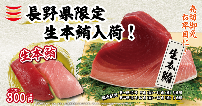 コロワイドグループのかっぱ寿司(カッパ・クリエイト(株) 本社:神奈川県横浜市 代表取締役社長 小澤俊治)は、2020年10月9日(金)~11日(日)および10月16日(金)~18日(日)の合計6日間、かっぱ寿司長野県内22店舗限定で『生本鮪』を販売致します。