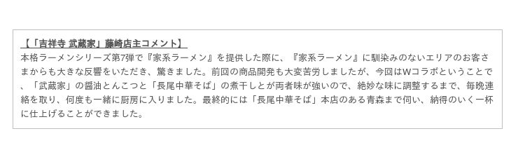 そして9月9日(水)より販売している、本格ラーメンシリーズ史上初となる2店の超有名ラーメン店「吉祥寺 武蔵家」と「長尾中華そば」がWコラボした「本格ラーメンシリーズ」第11弾『煮干しとんこつ醤油ラーメン』について、「吉祥寺 武蔵家」藤崎店主より開発秘話についてお話しいただきました。