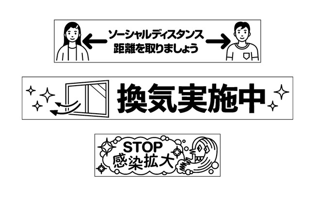 ソーシャルディスタンスを促すものや換気実施を知らせるもの、アマビエをあしらったものなど、公共空間でのアテンションを促す新規デザイン20種類を追加。6月より公開されている20種類を含む、計40種類を提供します。また、オリジナルのラベル作成用として、計60種類(うち新規デザイン34種類)のイラストを公開。オフィス内での注意喚起や商業施設、飲食店でのお客様へのお知らせをはじめ、幅広いシーンでご活用いただけます。