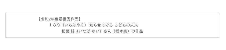 全国から公募を行い、応募数4,641作品の中から最優秀作品を選考しました。厚生労働省が作製する各種広報媒体に掲載します。最優秀作品の作者には、厚生労働大臣賞が授与されました。