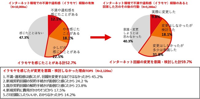 今回実施したSCR調査対象者(N=10,000ss)のうち、インターネット環境に“イラモヤ”を感じたことがある人は、過半数(52.7%)にのぼり、また、“イラモヤ”を感じた後インターネット回線の変更を意識・検討した人は59.7%。一方、意識・変更しようと思わなかった人は40.3%で、その理由は多い順に「回線を変更するほどのイラモヤではなかった」「新規契約回線の契約手続き/既存契約回線の解約手続きが面倒そう」と続きました。