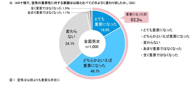 コロナ禍という大きな潮流の中で、目に見えない“空気”に対する生活者の意識は変化しているのでしょうか。「コロナ禍で、空気の重要性に対する意識は以前と比べてどのように変わりましたか」と聞いたところ、約6割(63.3%)の人(「とても重要になった」(16.6%)、「どちらかといえば重要になった」(46.7%)の計)が、“空気”は以前よりも「重要になった」と認識していることが分かりました(図1)。