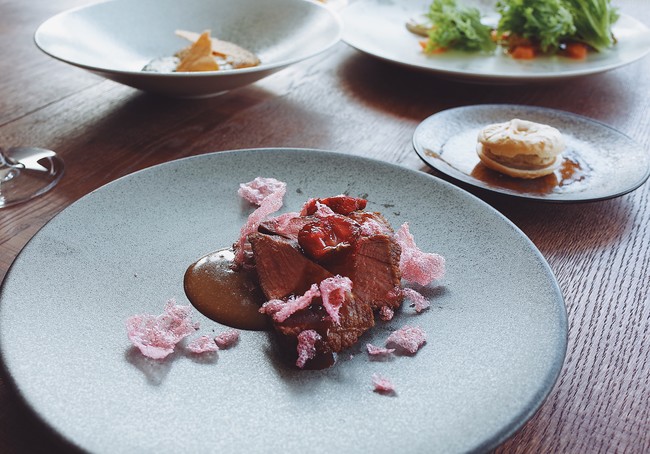 熊本産赤牛のロースト/黒大蒜のクリーム/セミドライ苺/クランベリーチップ/エシャロットソース