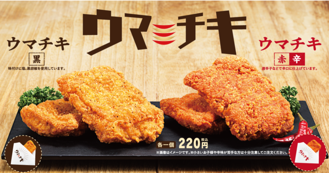 黒胡椒がきいた「黒」と唐辛子を効かせた「赤」の2種類をご用意。どちらもジューシーな鶏もも肉と、スパイシーでサクサクとした衣が美味しさのポイント。そんな『ウマチキ』はさっぱりとしたシャリとの相性も抜群!『ウマチキ黒』をどどんと乗せたインパクトのある見た目の『フライドチキンにぎり』も同時販売致します。