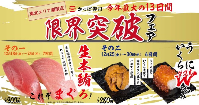 かっぱ寿司では「上質なお寿司をお手頃なお値段でお楽しみいただきたい」という想いから、これまでも期間やエリア限定で美味しい商品のお得なフェアを開催してまいりました。このたび、東北の皆さまへ2020年感謝の気持ちを込めて、東北エリア“超”限定で2020年最初で最後、そして最大となる「限界突破フェア」を二弾に分けて緊急開催いたします。