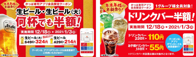 コロワイドグループのかっぱ寿司(カッパ・クリエイト(株) 本社:神奈川県横浜市 代表取締役社長 小澤俊治)は、2020年12月18日(金)~2021年1月3日(日)の期間中、かっぱ寿司で使用できる「生ビール半額クーポン」「ドリンクバー半額クーポン」をかっぱ寿司公式アプリ会員に配信いたします。