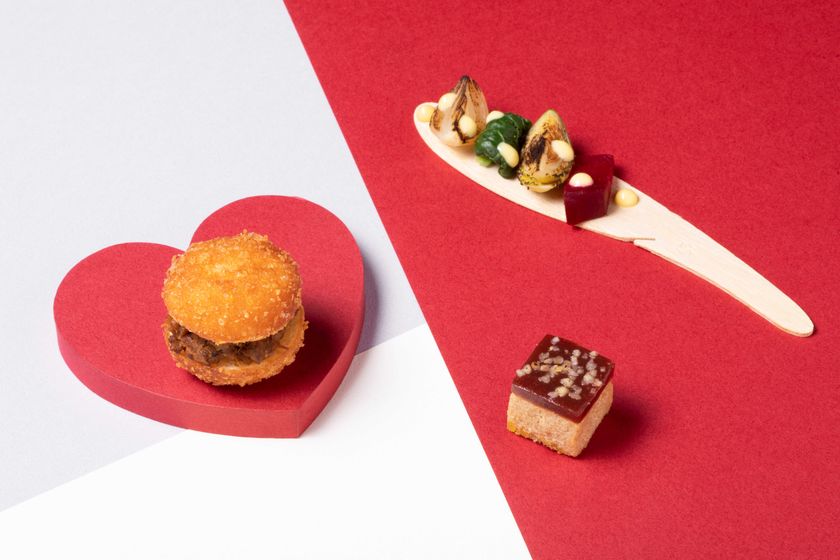 「フォアグラのキューブ ストロベリーバルサミコとローストアーモンド」(写真(5)中央)