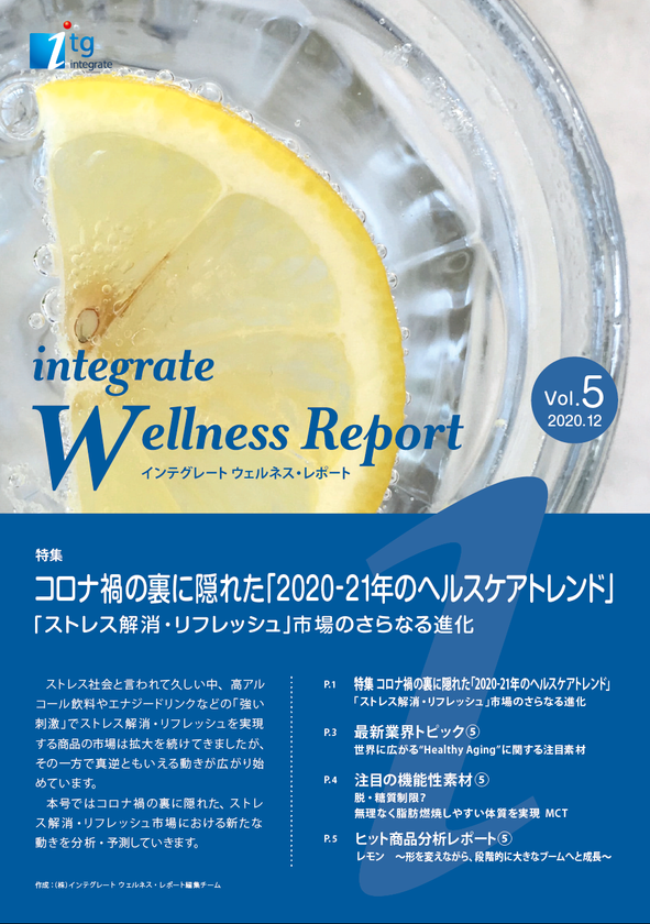 株式会社インテグレート(本社:東京都渋谷区、代表取締役CEO:藤田 康人、以下、インテグレート)は、コロナ禍の裏に隠れた、ストレス解消・リフレッシュ市場における新たな動きを分析・予測した「インテグレート ウェルネス・レポート Vol.5」を公開いたしました。インテグレートでは、食品・食品素材を中心としたウェルネス(Wellness)分野におけるトレンドの分析や今後の注目素材などをまとめたホワイトペーパーを随時公開しており、本号は第5号となります。