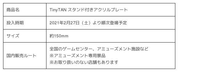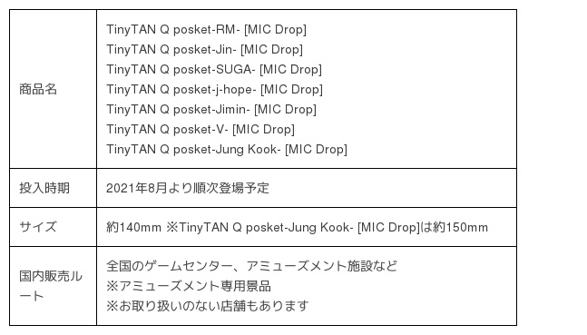 バンプレストブランドの人気フィギュア「Q posket」のオリジナルイラストを使用した「TinyTAN」の商品を、2021年2月以降、全国のアミューズメント施設などで順次投入予定です。メンバー7人が「Q posket」の特徴的な世界観でイラスト化されたデザインとなっています。