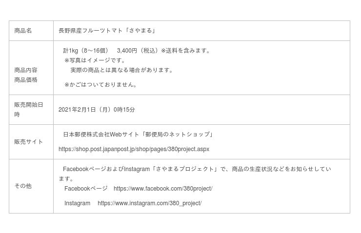 この商品は、日本郵便が2018年10月から長野県長野市で物販商品開発のために実証実験を行い、2020年2月にフルーツトマト「さやまる」として初めて販売したオリジナル商品です。