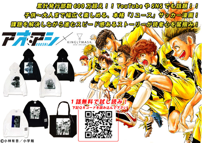 小林有吾先生作の本格Jユースサッカー漫画「アオアシ」と“いつもココロにワクワクを”をテーマに原宿を中心に展開するアパレルブランドKINGLYMASKのスペシャルコラボアイテムが数量限定で発売されます。