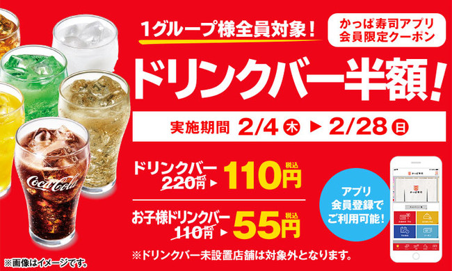 コロワイドグループのかっぱ寿司(カッパ・クリエイト(株) 本社:神奈川県横浜市 代表取締役社長 小澤俊治)は、2021年2月4日(木)~2月28日(日)の期間中、かっぱ寿司で使用できる「ドリンクバー半額クーポン」をかっぱ寿司公式アプリ会員に配信いたします。