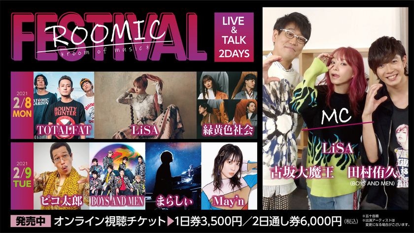 LiSA、古坂大魔王、田村侑久(BOYS AND MEN)ら中京エリアと縁の深い3人がMCを務める「ROOMIC」は、“ROOM OF MUSIC”=音楽の部屋でトークしたり、楽器を演奏したり、歌ったりとゆるくて自由な音楽番組です。今回開催されるイベントでは、LiSAら番組レギュラーMCが両日司会を担当。8日はTOTALFAT、LiSA、緑黄色社会が、9日にはピコ太郎、BOYS AND MEN、まらしぃ、May'nが生配信ならではの臨場感あふれる熱いライブを披露します。また、ゆるさが持ち味の番組だけに、司会陣とゲストの間でどのようなトークが繰り広げられるかにも注目。