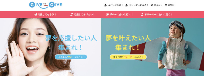 「GIVE AND GIVE」は、夢を応援する人(ギバー)と夢を叶えたい人(ドリーマー)で、夢の応援社会を作るマッチングサイトです。