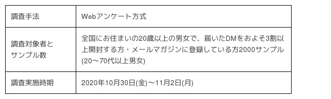 ※本調査はDMの平均受け取り通数や開封・閲覧状況、開封したくなるキーワード、形状、開封後の行動など、生活者がDMを「実際に受け取ってから」にフォーカスしています。