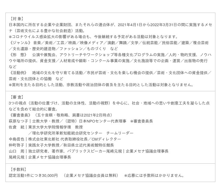 ●「メセナアワード」との関係は?: TIMに認定した翌年に、特に優れた活動を「メセナアワード」(後援:文化庁)にて表彰します。「TIM2021」認定活動は、「メセナアワード2022」の選考対象となります。