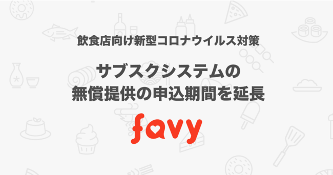 食マーケティング総合企業の株式会社favy(代表取締役社長:高梨巧、本社:東京都新宿区)は、緊急事態宣言の延長に伴い、「favyサブスク」の無償提供に関する申込期間を延長することをお知らせいたします。