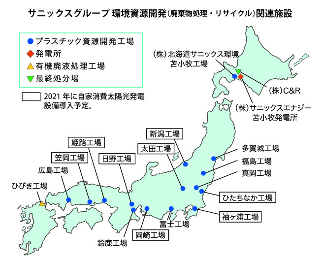 当社グループは、廃プラスチックをエネルギーとして再生する資源循環型発電事業をはじめ、廃棄物リサイクルに取り組んでいます。全国15箇所のプラスチック資源開発工場で、廃プラスチックを燃料化し、グループ会社のサニックスエナジー苫小牧発電所等で、使用しています。