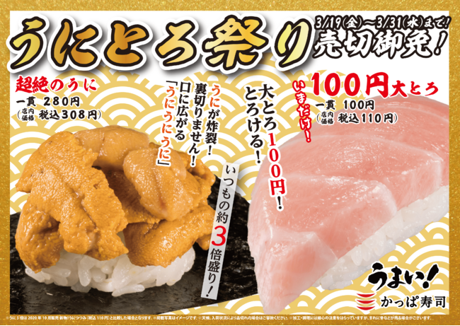 コロワイドグループのかっぱ寿司(カッパ・クリエイト(株) 本社:神奈川県横浜市 代表取締役社長 田邊公己)は、2021年3月19日(金)~3月31日(水)の13日間限定、かっぱ寿司全店にて「うにとろ祭り」を開催いたします。