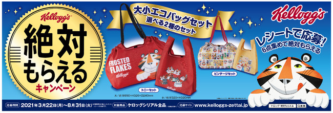 シリアル食品の世界シェアトップブランド「ケロッグ」を日本国内で展開する日本ケロッグ合同会社(本社:東京都千代田区、代表職務執行者社長:井上ゆかり)は、「ケロッグ 絶対もらえるキャンペーン」を3月22日(月)より実施いたします。今年も、全製品※が対象となっており、購入レシートを撮影して点数を6点分ためて応募すると、ケロッグの人気キャラクターがデザインされたオリジナルの大小エコバッグセットが必ずもらえます。