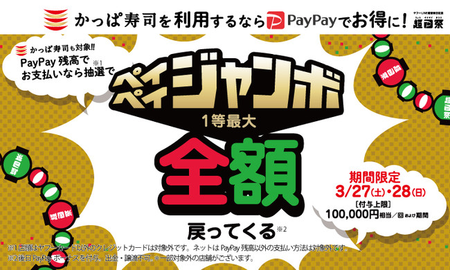 コロワイドグループのかっぱ寿司(カッパ・クリエイト(株) 本社:神奈川県横浜市 代表取締役社長 田邊公己)は、2021年3月27日(土)、3月28日(日)の2日間、PayPay株式会社(本社:東京都千代田区 代表取締役社長執行役員CEO:中山一郎)主催の「超PayPay祭!フィナーレジャンボ」に参加いたします。